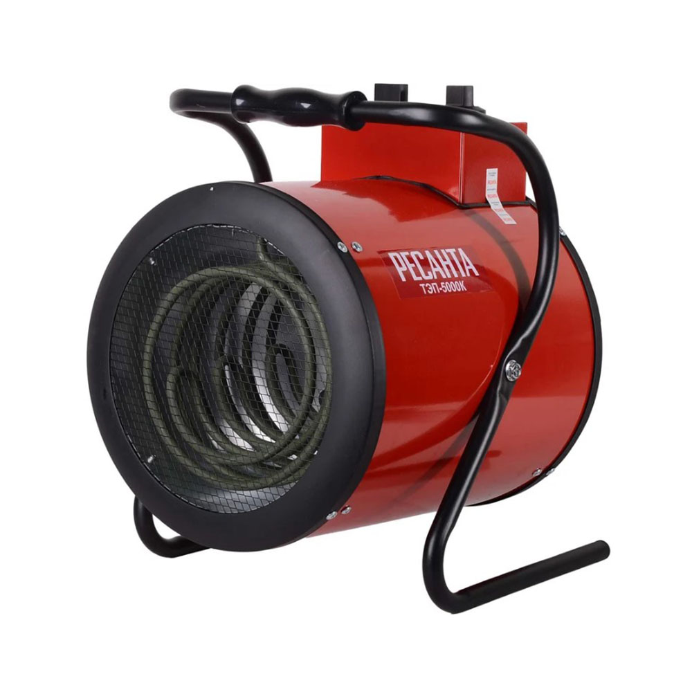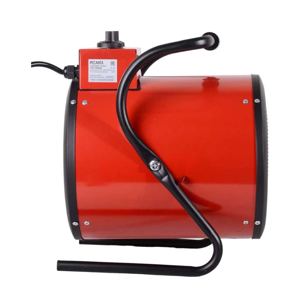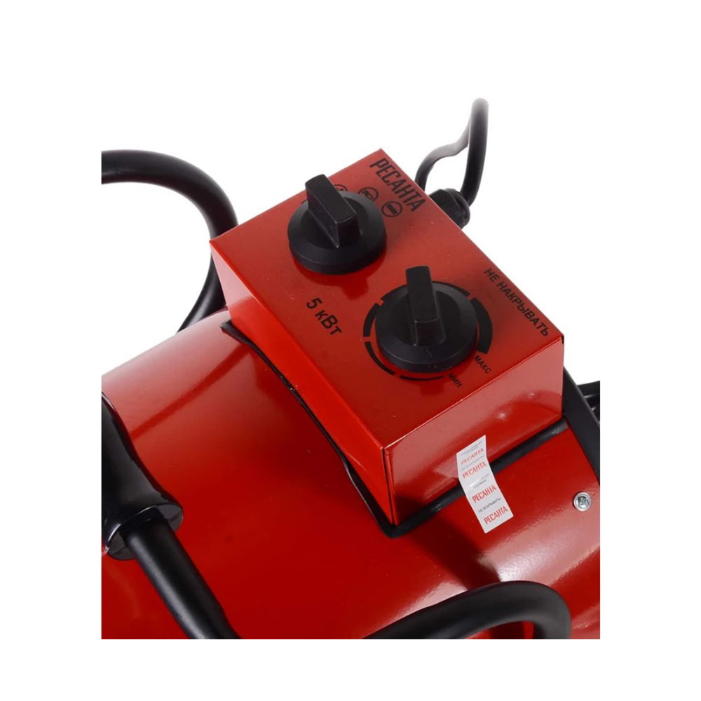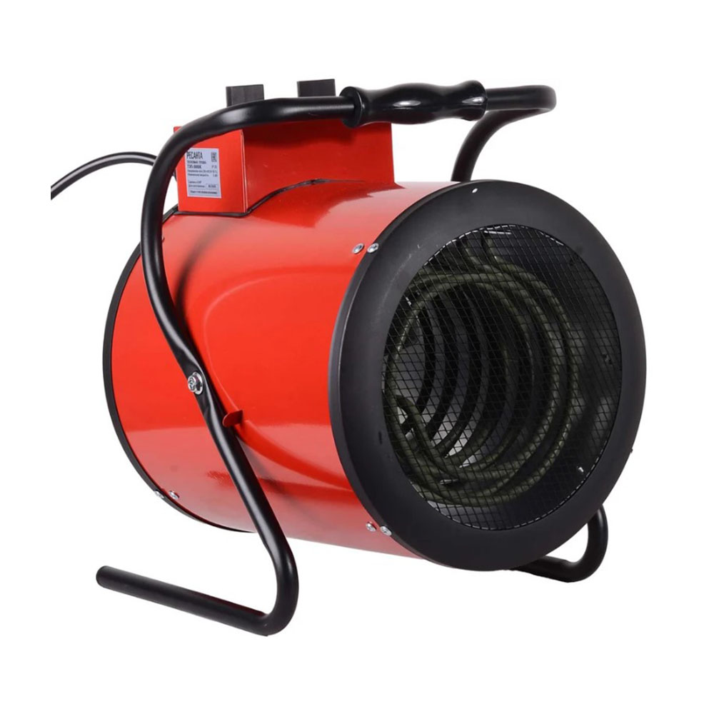 Тепловая электрическая пушка ТЭП-5000К 5000Вт Ресанта - работающая в 2 режимах обогрева и режиме вентилирования, будет эффективна в использовании на самых разных объектах: начиная частным домом и заканчивая производственным цехом. Теплопушка устанавливается на пол в помещение, которое требует обогрева, и подключается к электросети 380В. На корпусе устройства имеются 2 регулятора. С помощью одного вы можете выбрать режим работы агрегата: 50 Вт (вентиляция), 3300 Вт (нагрев на средней мощности), 5000 Вт (полная мощность). После выбора режима можно подобрать оптимальную температуру. Терморегулятор нужно медленно вращать по или против часовой стрелки, увеличивая или уменьшая градусы. Основу конструкции электрической теплопушки составляют ТЭН и вентилятор. Первый обеспечивает нагрев воздуха, второй отвечает за конвекцию и распределение тепла в помещении. Наличие системы термозащиты обеспечивает надежность работы устройства и его безопасность в случае перегрева. При необходимости прибор можно перенести в другое место. Тепловая пушка весит 8,3 кг и оснащена удобной ручкой. Экологичная, эффективная, простая в управлении модель Ресанта ТЭП-5000К пригодится в ремонтной мастерской, цеху, на даче. Она обеспечит безопасный обогрев любого неотапливаемого помещения зимой и может использоваться в качестве вентилятора летом.