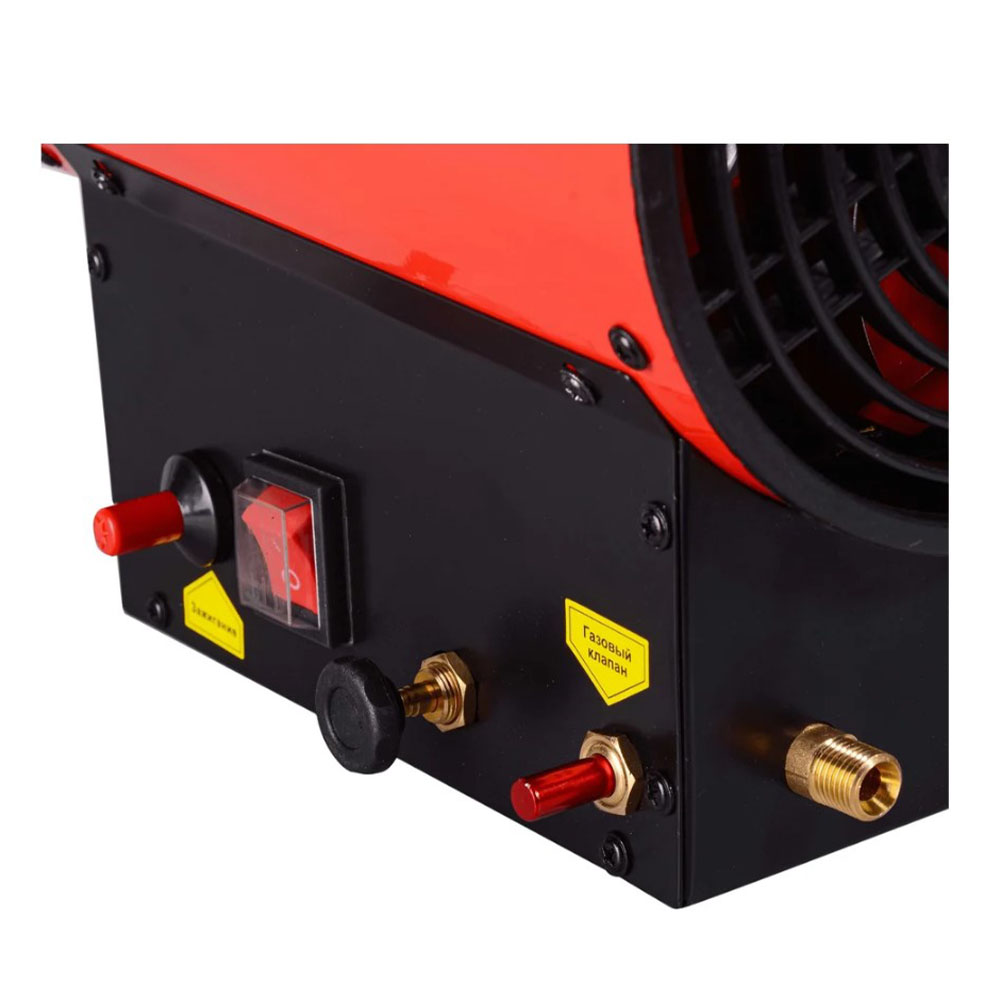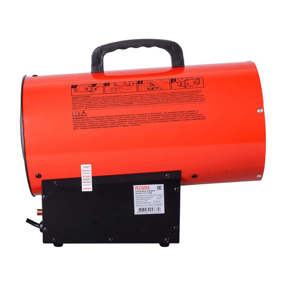 Тепловая газовая пушка Ресанта ТГП-12000 - эффективный нагреватель воздуха, использующий в качестве топлива сжиженные газы: пропан, пропан-бутан, бутан. Применяется для обогрева складских помещений, цехов, ремонтных мастерских площадью до 120 м², а также при монтаже натяжных потолков, для просушки окрашенных стен и штукатурки. Тепловая мощность имеет диапазон 7-12 кВт. Двигатель обеспечивает воздушный поток производительностью 370 м³/час. Сжиженный газ создает высокую температуру в камере сгорания тепловой пушки. Электрическая энергия однофазной сети необходима для работы вентилятора и функционирования автоматических узлов. Зажигание осуществляется с помощью пьезоэлектрического элемента. Теплопушка отличается экономичным расходом топлива 0,6-0,9 кг/час. Подача газа осуществляется под давлением 0,7 Бар. Контроль пламени происходит с помощью термодатчика из биметалла. Для обеспечения пожарной безопасности предусмотрена система защиты от перегрева. При отсоединении газового шланга тепловая пушка выполняет функцию вентилятора. Генерация тепла газовой теплопушки Ресанта ТГП-12000 происходит от открытого пламени, что создает эффективную теплоотдачу и экономит электроэнергию. Ручка в верхней части корпуса предназначена для удобства переноски. Прорезиненные ножки обеспечивают устойчивое положение оборудования. Защита от угасания пламени исключает утечку газа.
