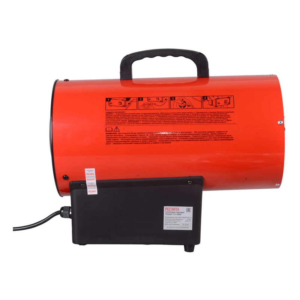 Тепловая газовая пушка Ресанта ТГП-15000 - это высокопроизводительный воздухонагреватель, который работает на сжиженном газе. Благодаря высокой мощности, хорошо подходит для обогрева помещений большой площади. Имеет простую и надежную конструкцию, но не комплектуется дымоходом, поэтому продукты сгорания поступают в помещение, по этой причине может использоваться только на складах, в ангарах, промышленных цехах и в других нежилых строениях. Применение газовой тепловой пушки возможно только в местах с доступом к электросети. Электроэнергия необходима для работы вентилятора и автоматики, которая обеспечивает безопасную эксплуатацию. Тепловая пушка обеспечивает высокую скорость нагрева, но также может работать в режиме вентиляции без подогрева воздуха. Ресанта ТГП-15000 экономно потребляет топливо и соответствует высоким нормам пожарной безопасности. Имеется защита от угасания пламени. При угасании пламени автоматика перекрывает подачу газа, что исключает возникновение опасной ситуации. Газовая теплопушка данной модели отличается простотой установки и эксплуатации. Запуск устройства занимает считанные минуты и не требует специальных навыков.