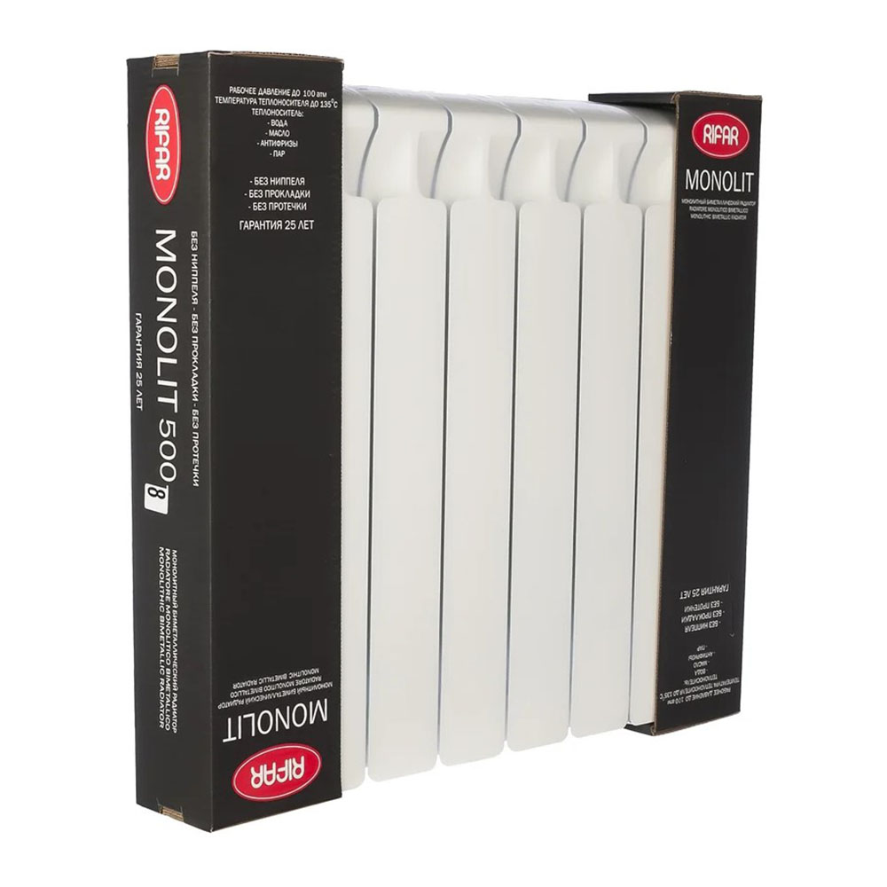 Радиатор биметалл 500х100 8 секций Боковое подключение RIFAR MONOLIT - предназначен для отопления жилых, общественных, административных и производственных зданий как с замкнутыми, так и с открытыми системами отопления. Имеет стандартные резьбовые соединения 3/4" (20 мм).