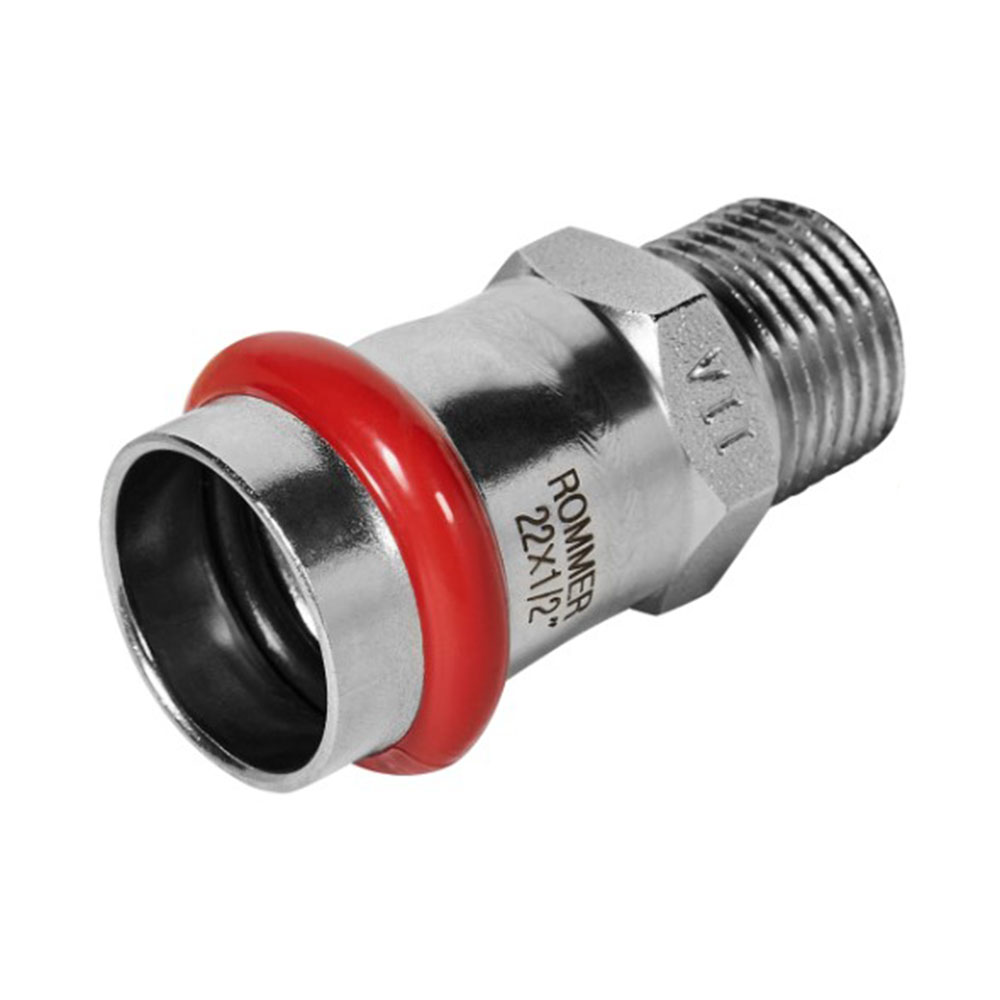Переходник ВПр-НР Ø 22х1/2" Нержавеющая сталь пресс ROMMER - переходник из нержавеющей стали с наружной резьбой диаметром 22 мм с одной стороны и 1/2 дюйма с другой, предназначенный для герметичного и надежного соединения элементов систем отопления и водоснабжения. Устойчив к коррозии, воздействию высоких температур и давления.