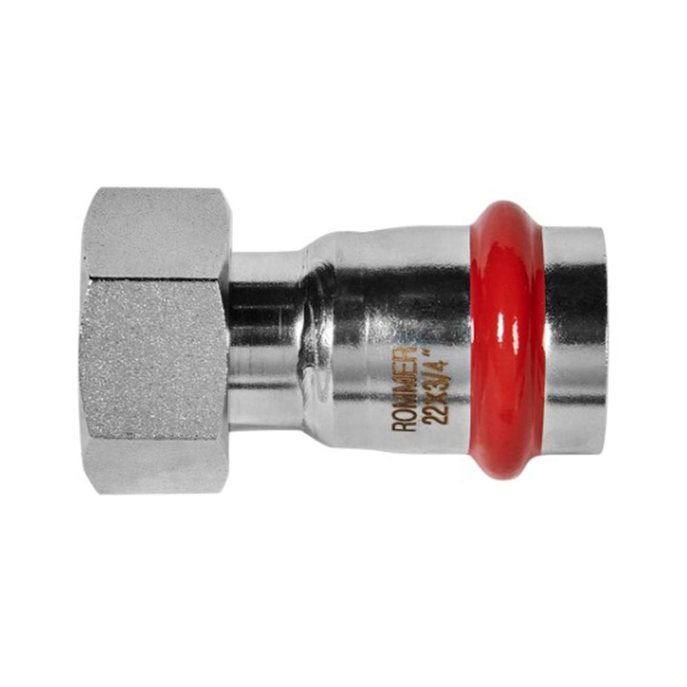 Переходник ВПр-ВР Ø 22х3/4" накидная гайка Нержавеющая сталь пресс ROMMER - переходник из высококачественной нержавеющей стали с накидной гайкой, предназначенный для герметичного соединения труб диаметром 22 мм и 3/4 дюйма. Оснащен встроенным обратным клапаном для регулировки потока теплоносителя и предотвращения его обратного тока в системах отопления и водоснабжения.