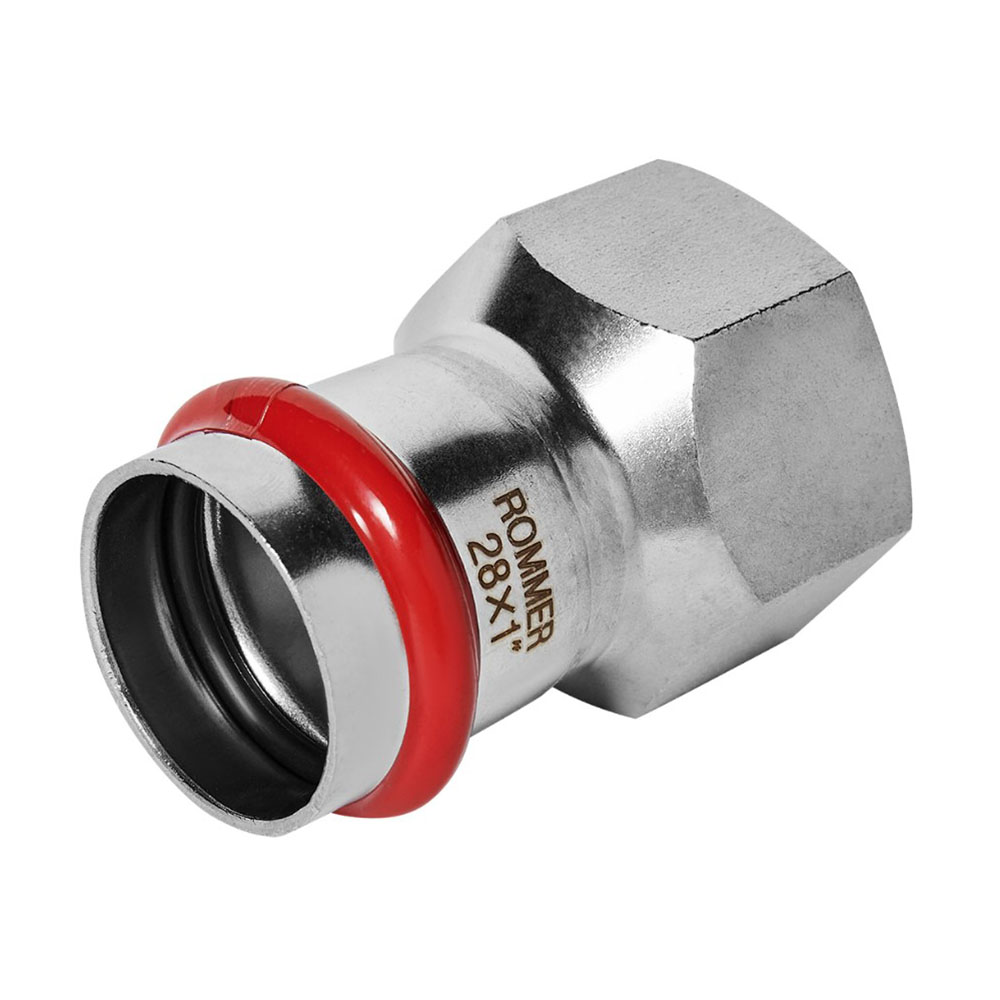 Переходник ВПр-ВР Ø 28х1" Нержавеющая сталь пресс ROMMER - является переходником из нержавеющей стали с внутренним резьбовым соединением, диаметр которого составляет 28 мм с одной стороны и 1" - с другой. Этот переходник используется для создания надёжных и герметичных соединений в системах теплоснабжения и водопровода.