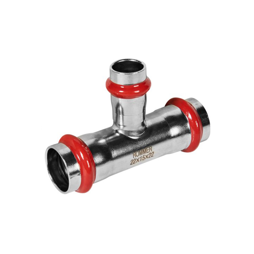 Тройник-переходник ВПр Ø 22х15х22 Нержавеющая сталь пресс ROMMER - является переходным тройником из нержавеющей стали AISI 304, имеющим диаметры выходов 22, 15 и 22 мм. Используется в системах отопления и водоснабжения для разветвления и соединения труб. Отличается надежностью, герметичностью и долгим сроком службы. Устойчив к высоким температурам, давлению и коррозии.