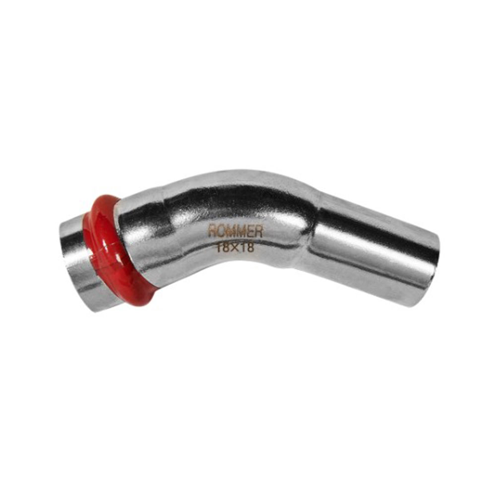 Угольник однораструбный Впр-Нпр Ø 18 мм 45° Нержавеющая сталь пресс ROMMER - это однораструбный угольник из нержавеющей стали с углом 45 градусов и диаметром 18 миллиметров. Используется в системах отопления и горячего водоснабжения для обеспечения надежного и герметичного соединения элементов трубопровода.