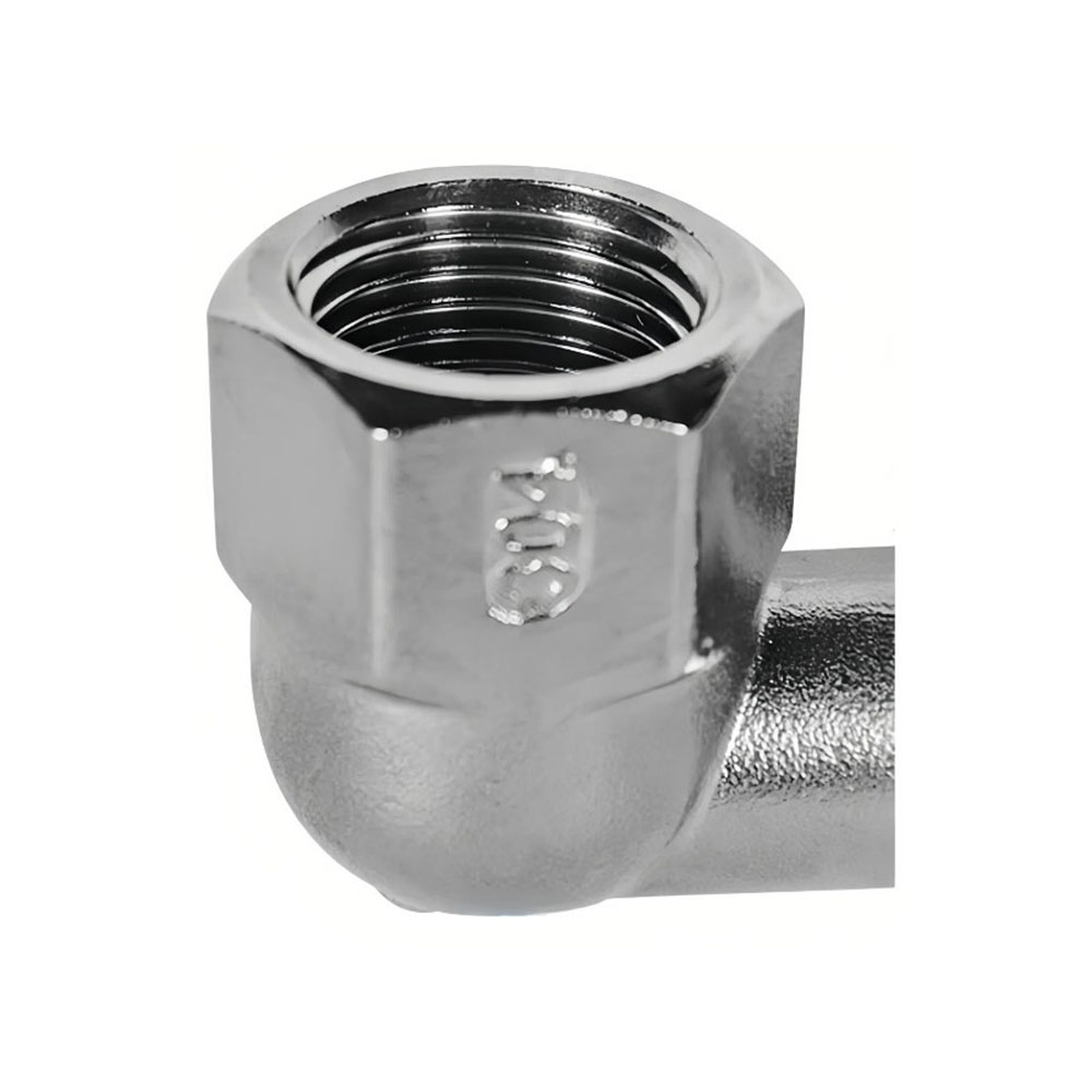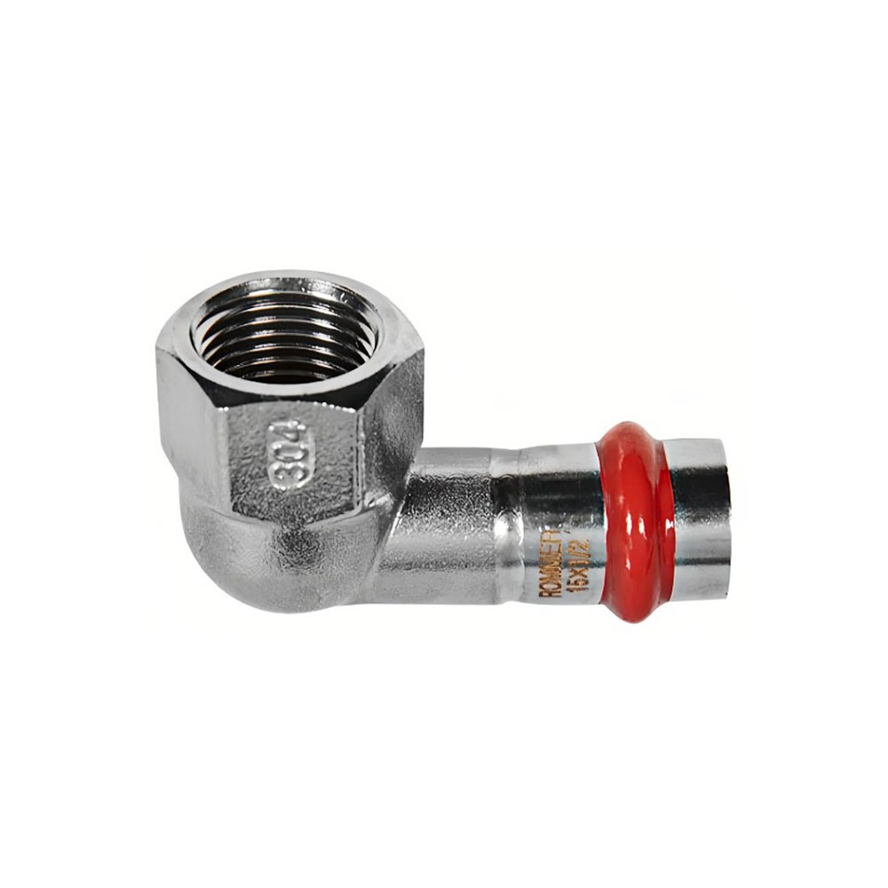 Угольник-переходник ВПр-ВР Ø 15х1/2" Нержавеющая сталь пресс ROMMER - это угольник-переходник из нержавеющей стали AISI 304 со значениями диаметров 15 и ½ дюйма. Применяется для соединения элементов системы отопления или водоснабжения, обеспечивая надёжное и герметичное крепление.