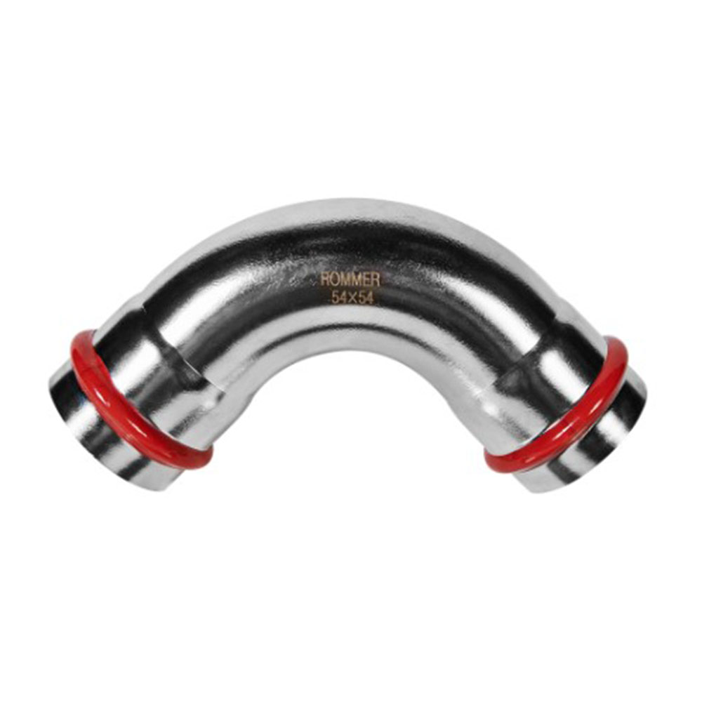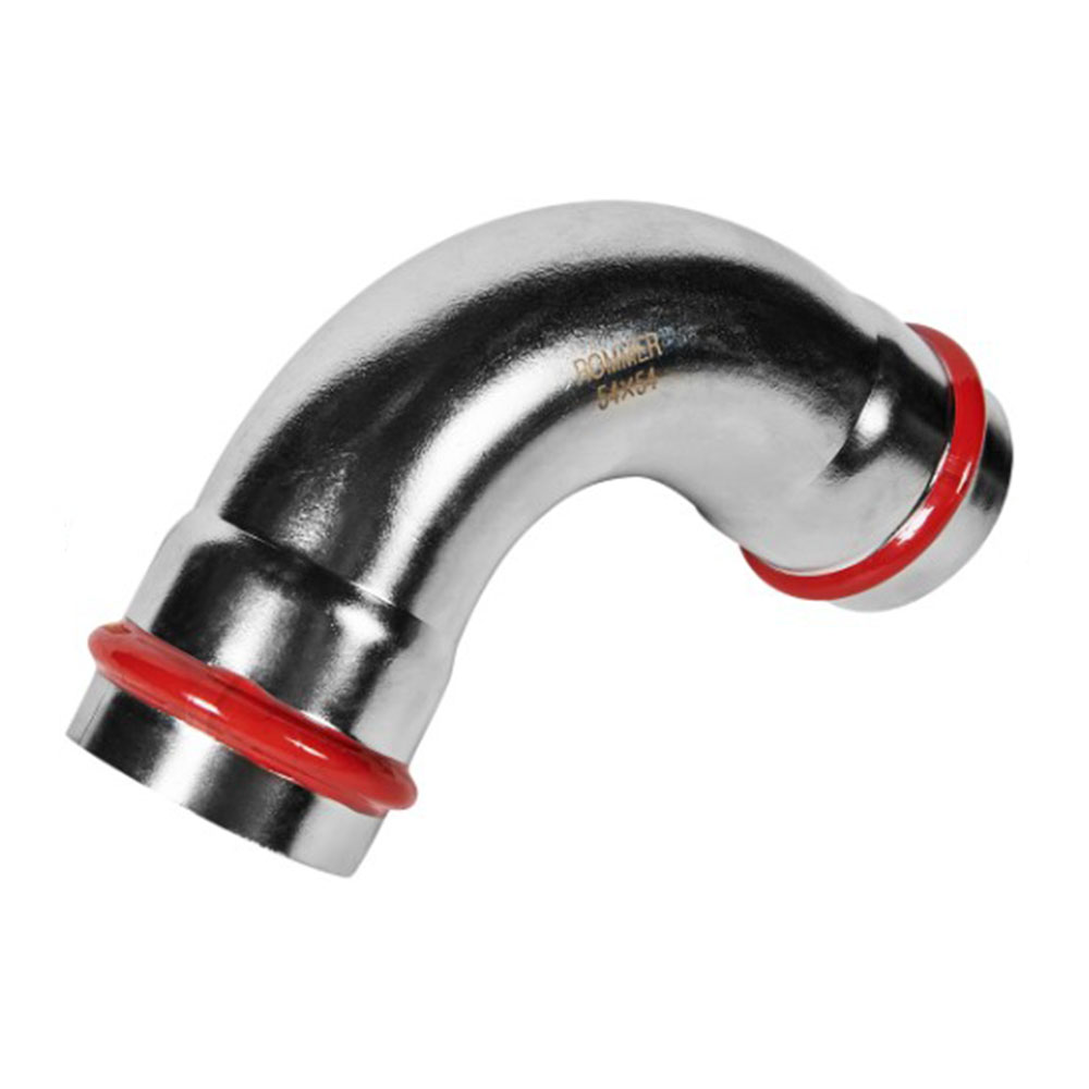 Угольник Впр-Впр Ø 54 мм 90° Нержавеющая сталь пресс ROMMER - это угольник с углом 90 градусов и диаметром 54 миллиметра, изготовленный из нержавеющей стали. Применяется для монтажа отопительных и водопроводных систем, обеспечивая надежное и герметичное соединение.