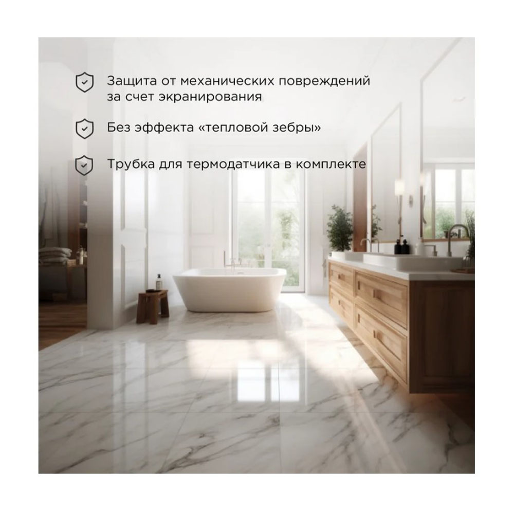 Теплый пол нагревательный мат 8 м² 0,5х16 м 1280Вт REXANT Extra - предназначен для обогрева помещений и обеспечивает равномерное распределение тепла по всей площади. Мощность поверхностного тепловыделения составляет 160 Вт/м². Принцип действия материала заключается в том, что тонкий кабель, изолированный фторопластом, равномерно распределяет тепло по всей площади поверхности. Алюминиевый экран защищает от электромагнитных помех, а ПВХ-оболочка обеспечивает повышенную теплостойкость и защиту от воздействия внешних факторов. Установка материала происходит быстро и легко, что позволяет сэкономить время и деньги на работах по укладке системы отопления. Заводское пластиковое соединение нагревательного кабеля и кабеля питания обеспечивает долговечную и безопасную эксплуатацию нагревательного мата.