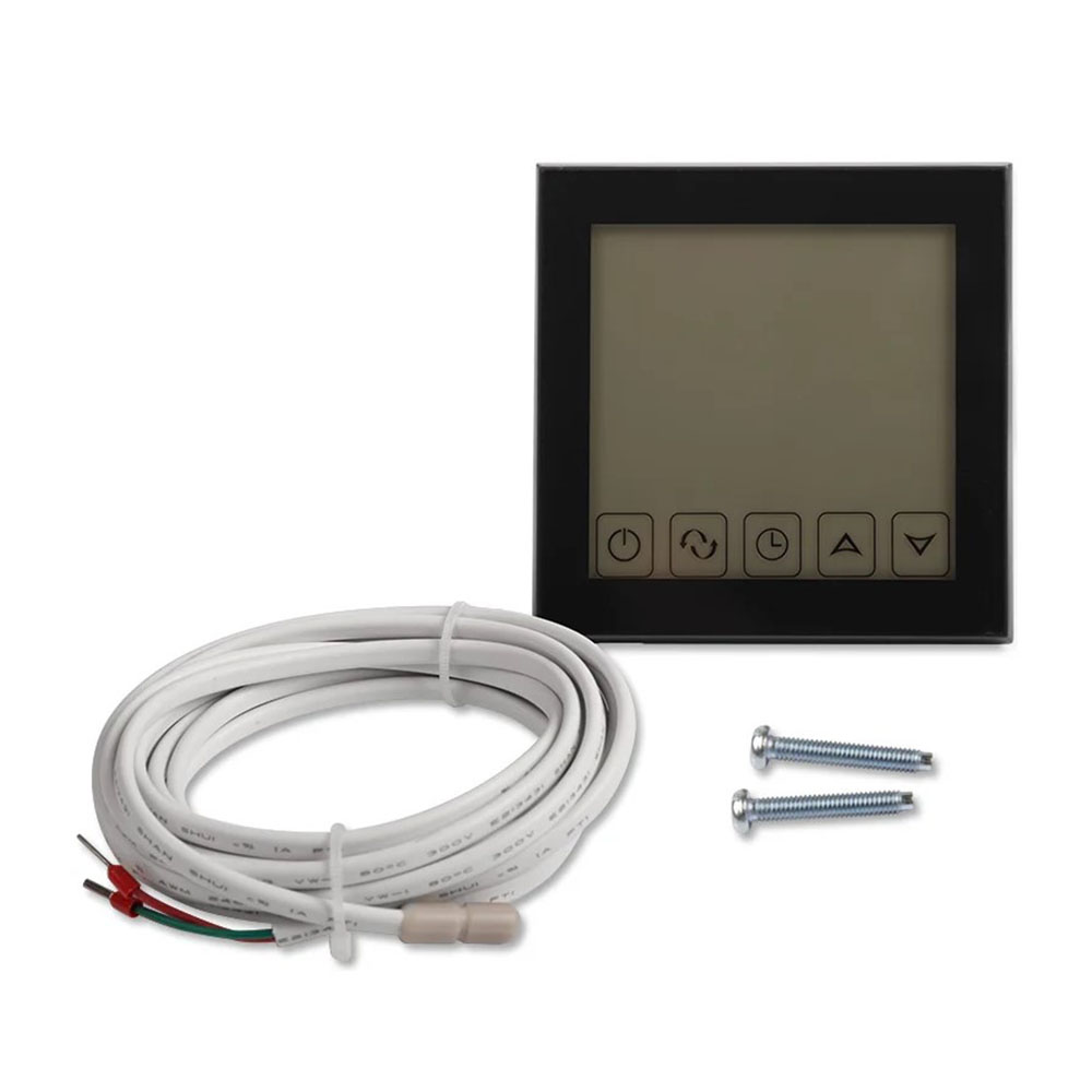 Терморегулятор цифровой R200B сенсорный с датчиком температуры Черный REXANT - подключается к системе отопления серии R200. На регуляторе устанавливается необходимая для помещения температура, регулятор сравнивает ее с реальной температурой и в зависимости от этого включает или выключает систему отопления. Это значительно экономит энергоресурсы. Все настройки устанавливаются на интуитивно понятном сенсорном дисплее. Программное управление дает возможность устанавливать 6 недельных программ, а также есть ручной режим.