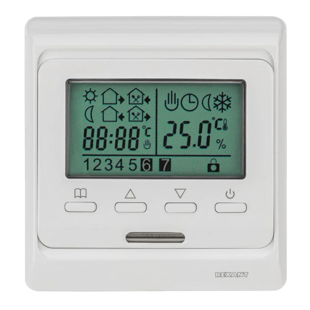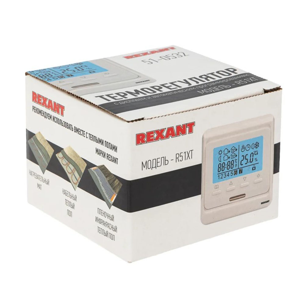 Терморегулятор цифровой R51XT с датчиком температуры Белый REXANT - предназначен для использования с различными системами напольного обогрева, такими как тёплые полы на основе резистивных кабелей, матов и инфракрасных плёнок. Это многорежимный термостат со встроенным блоком реального времени и календарём, который обеспечивает суточное распределение комфортной температуры по времени.