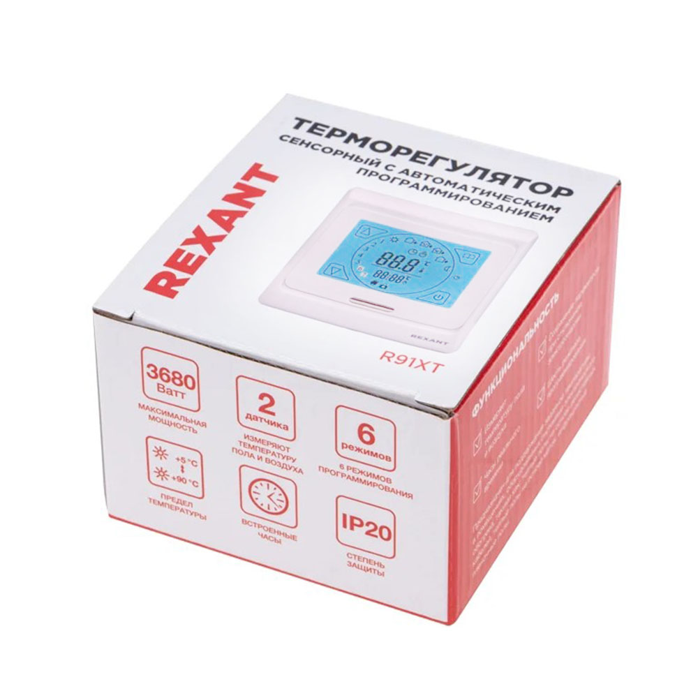 Терморегулятор цифровой R91XT сенсорный с датчиком температуры Белый REXANT - автоматически программирует и контролирует температуру в помещении. Максимальная нагрузка составляет 3680 Вт, что позволяет управлять разными видами обогревателей и кондиционеров. Автоматическое программирование даёт возможность настроить устройство на определённое время работы и температурный режим в течение дня, что помогает экономить энергию и обеспечивать комфортную температуру в любое время суток. Терморегулятор оснащён сенсорным экраном, обеспечивающим простоту использования и удобство настройки. На экране отображаются текущая температура в помещении, все необходимые настройки и параметры. Также есть функция блокировки клавиатуры, предотвращающая случайные изменения настроек. Встроенный датчик температуры гарантирует более точное измерение температуры в помещении, что позволяет устройству быстро реагировать на изменения и поддерживать заданный температурный режим.