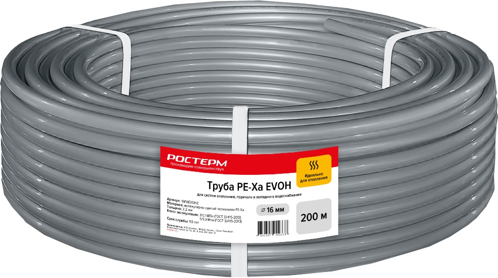 Труба PЕ-Ха EVOH 16х2.2 мм Сшитый полиэтилен с кислородным слоем Серый 200 м РОСТерм, изготовлена из материала высокой прочности - сшитого полиэтилена толщиной стенки 2.2 мм с кислородозащитным слоем EVOH. Трубы РОСТерм PЕ-Ха EVOH - это универсальные трехслойные трубы, которые используются как в радиаторном отоплении, так и в системах горячего и холодного водоснабжения. Температура эксплуатации труб PE-Xa составляет от +5 до + 95 °C (при транспортируемой жидкости - воде), 5 класс эксплуатации.