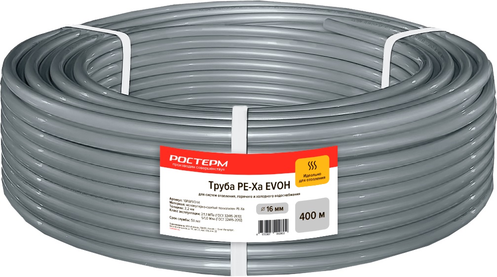 Труба PЕ-Ха EVOH 16х2.2 мм Сшитый полиэтилен с кислородным слоем Серый 400 м РОСТерм, изготовлена из материала высокой прочности - сшитого полиэтилена толщиной стенки 2.2 мм с кислородозащитным слоем EVOH. Трубы РОСТерм PЕ-Ха EVOH - это универсальные трехслойные трубы, которые используются как в радиаторном отоплении, так и в системах горячего и холодного водоснабжения. Температура эксплуатации труб PE-Xa составляет от +5 до + 95 °C (при транспортируемой жидкости - воде), 5 класс эксплуатации.