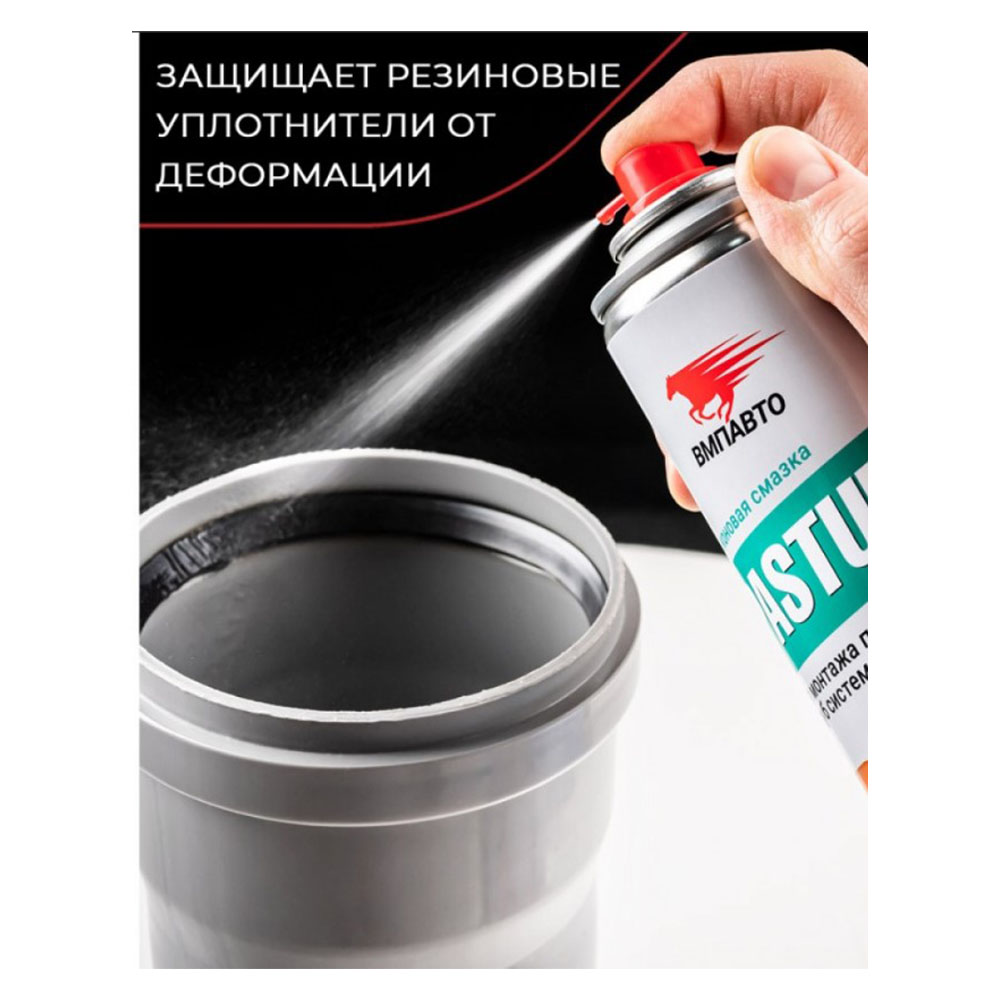 Смазка сантехническая силиконовая для раструбных соединений 400 мл баллон аэрозоль PASTUM 8111 - предназначена для монтажа пластиковых труб систем канализации, дренажа и водоотведения. Ускоряет монтаж и демонтаж труб и фасонных частей трубопровода. Обеспечивает подвижность системы в процессе эксплуатации. Защищает резиновые уплотнители от деформации, пересыхания и скручивания. Не токсична для окружающей среды. Смазка подходит для наружных и внутренних работ.