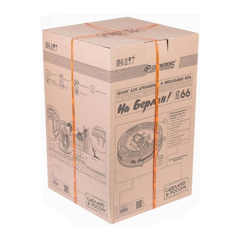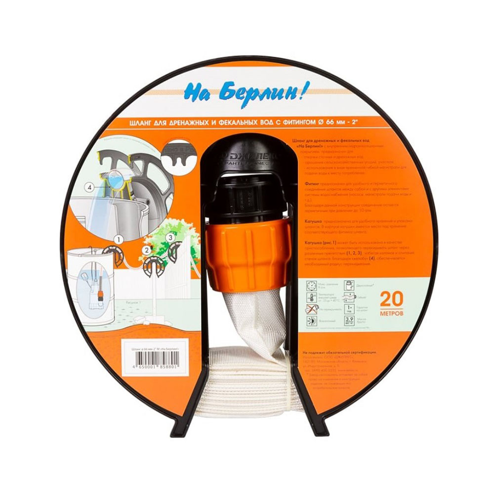 Шланг для дренажных и фекальных вод на Берлин Ø 66 мм с муфтой 2"M 20 метров 9015 Джилекс - предназначен для откачки дренажных и фекальных вод, орошения сельскохозяйственных угодий, участков. Используется в виде временной гибкой магистрали для подачи (отвода) воды к месту потребления (выброса).