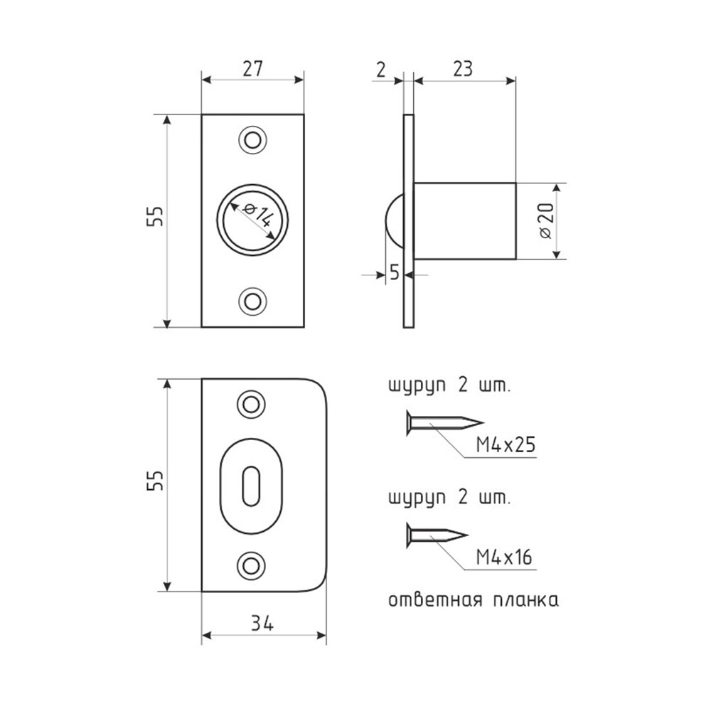 Ответная и лицевая планки изготовлены из сплава ЦАМ и имеют пятислойное гальваническое покрытие, которое защищает изделие от коррозии, истирания и царапин, сохраняя эстетичный вид на протяжении всего срока службы. Широкая цветовая палитра позволяет подобрать фиксатор под любую фурнитуру — от классического хрома до тёплого оттенка бронзы.