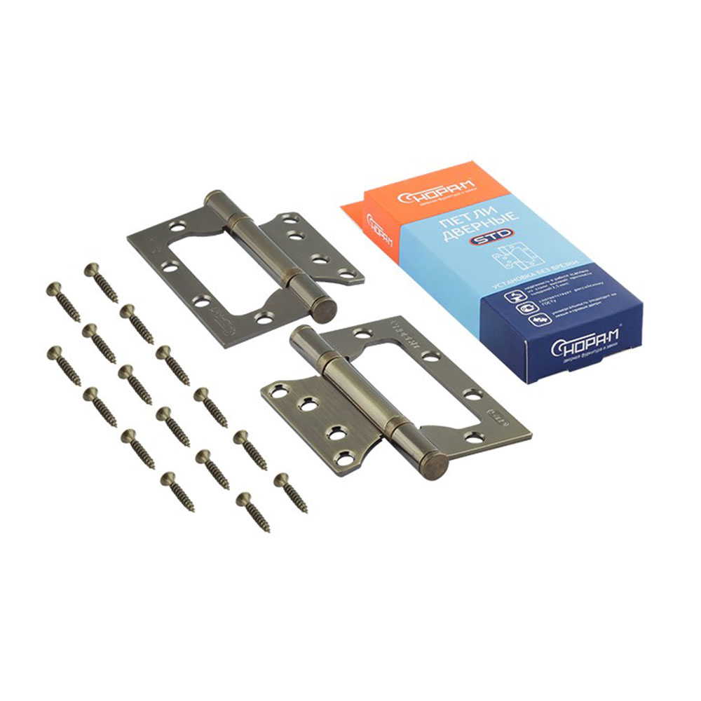 Петля накладная 100х75 Без врезки 800-4" Старая бронза Нора - надёжное и доступное решение для межкомнатных дверей. Петли подходят для дверей левого и правого открывания и имеют врезную конструкцию, обеспечивающую прочное крепление и аккуратный внешний вид. Роль подшипников выполняют четыре стальных кольца, которые гарантируют плавное открывание двери, отсутствие скрипов и долгий срок службы. Изготовлены из высокопрочной стали, соответствуют требованиям ГОСТ и выдерживают более 850 000 циклов открывания-закрывания.