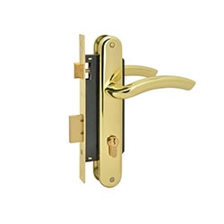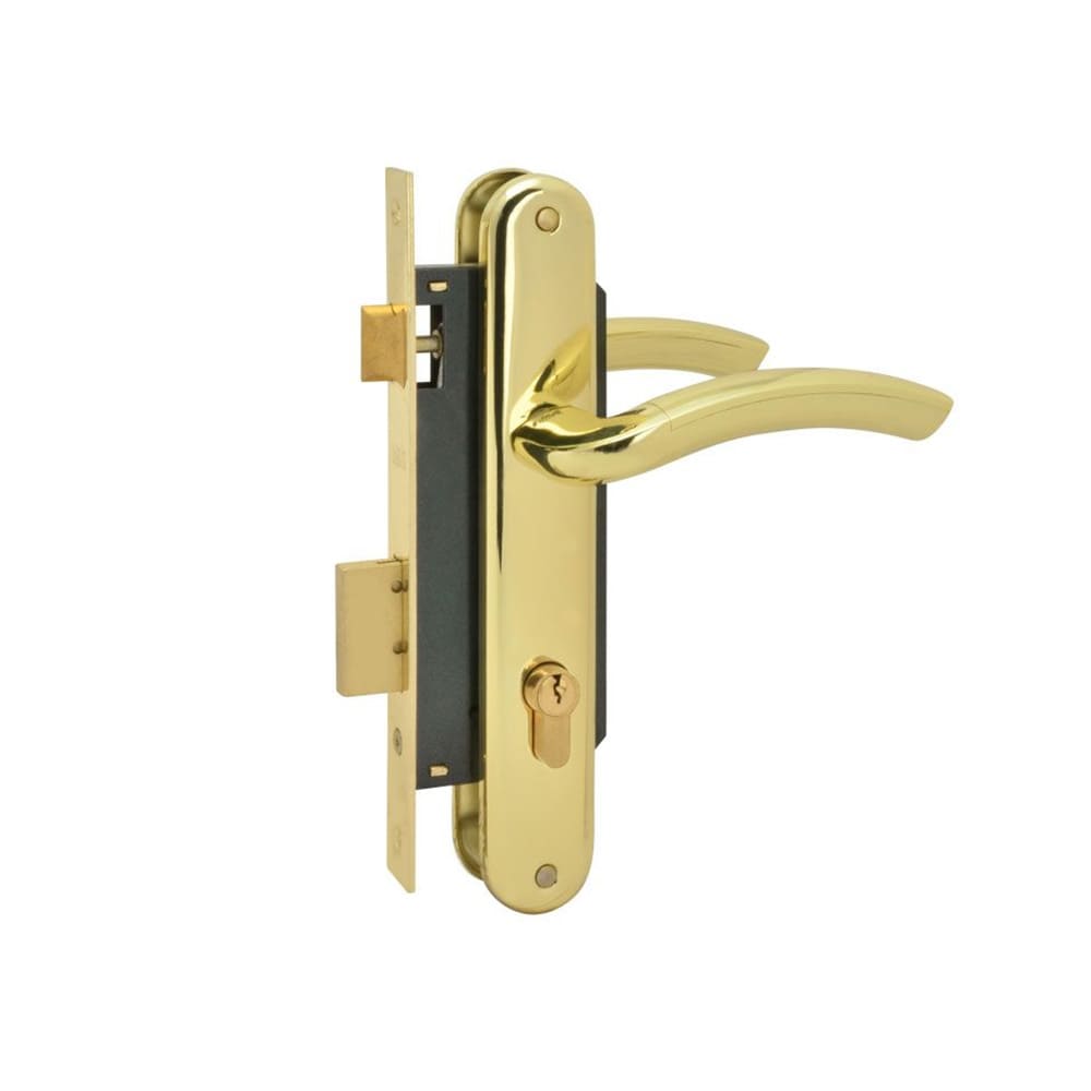 - Комплект состоит из: ручек на планке (2 шт.), корпуса замка (1 шт.), цилиндрового механизма (1 шт), ключей (5 шт), ответной планки (1 шт.). Также в комплекте идёт крепеж для установки корпуса, ручек на планке и цилиндра.