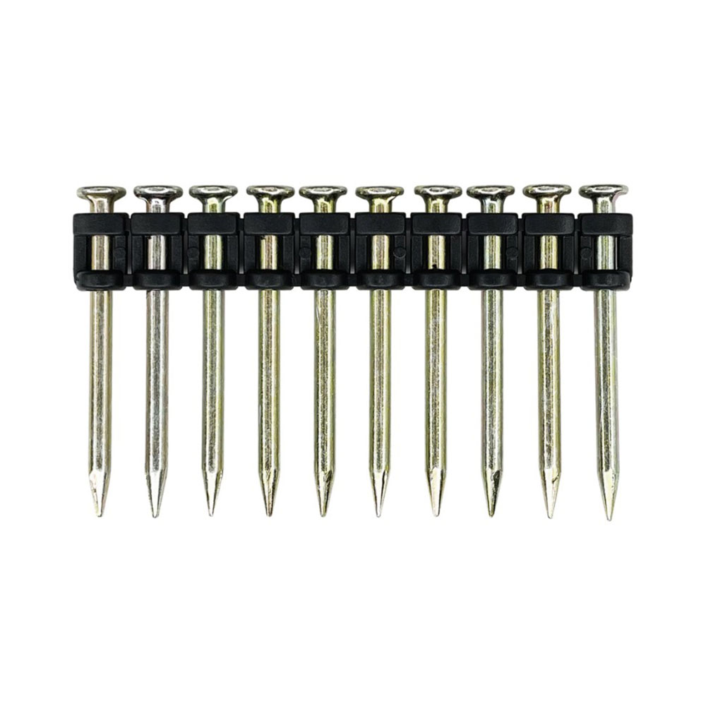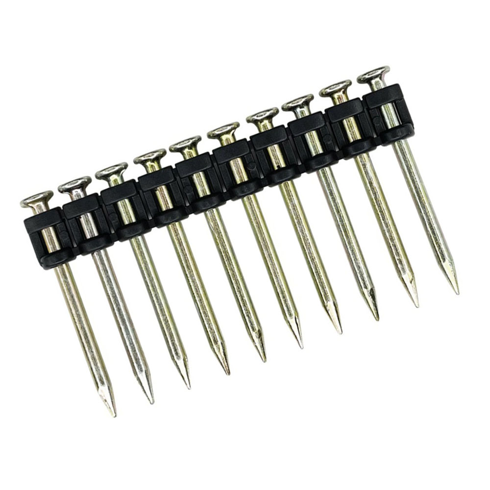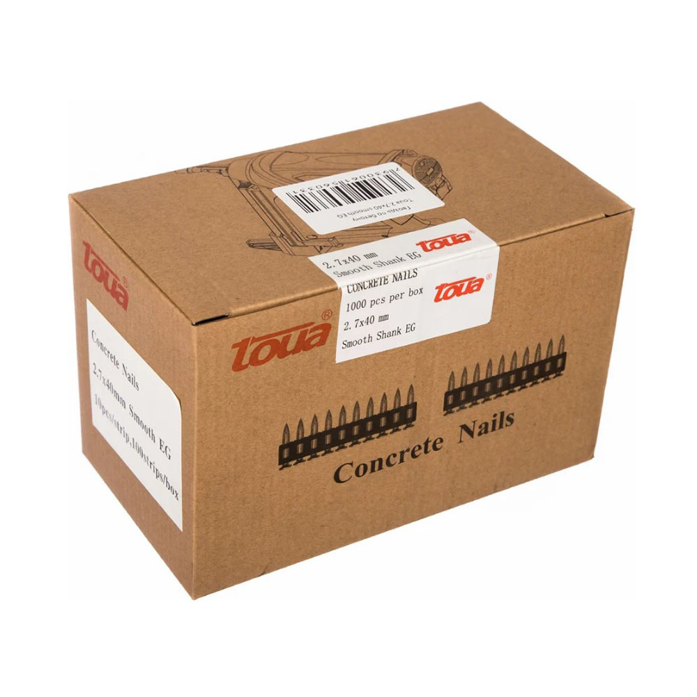 Гвозди под монтажный пистолет 2,7х40 мм 1000 шт Toua - используется для пристрелки к: кирпичной кладке оштукатуренному кирпичу поверхности из легкого бетона полнотелым и пустотелым цементным блокам * немассивному металлу толщиной от 3 до 6 мм. Подходят для большинства газовых, аккумуляторных и пневматических монтажных пистолетов. Создают минимальное давление на материал при забивании, поэтому низка вероятность трещин и сколов. Но тонкое тело может гнуться при попадании в твердую фракцию. Поэтому для твердых материалов используйте усиленные гвозди Toua.