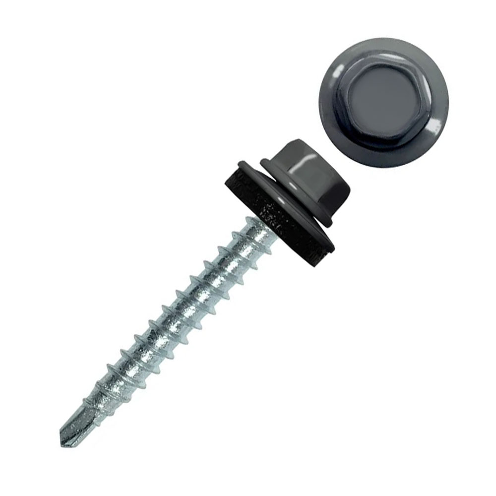 Кровельный саморез 5,5х19 мм RAL7024 Тёмно-серый - применяются для крепления металлочерепицы к деревянным и металлическим кровельным конструкциям. Изготовлены из оцинкованной стали. Наконечник - сверло. Саморез комплектуется шайбой и резиновой прокладкой EPDM. Головка шестигранная с буртом.