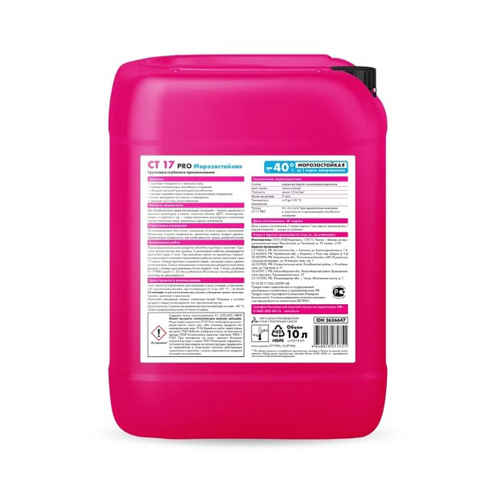 Грунтовка Морозостойкая глубокого проникновения с пигментом 10 л Церезит СТ17 PRO - предназначена для обработки поверхностей перед нанесением штукатурных и напольных смесей, плиточных клеев и т.д. Применяется для обработки всех видов впитывающих оснований: цементных штукатурок и стяжек, известковых и гипсовых штукатурок, легкого и ячеистого бетона, ангидритных стяжек, кладок из кирпича и природного камня, древесностружечных и древесноволокнистых плит, гипсокартона и т.д. Обладает высокой проникающей способностью, снижает впитывающую способность оснований, связывает пыль, укрепляет поверхность, предотвращает пересыхание тонкослойных выравнивающих смесей, повышает адгезию материалов к основанию, повышает растекаемость напольных смесей и предотвращает появление пузырьков воздуха на выравнивающем слое. Благодаря содержанию пигмента позволяет легко отличить обработанную поверхность.
