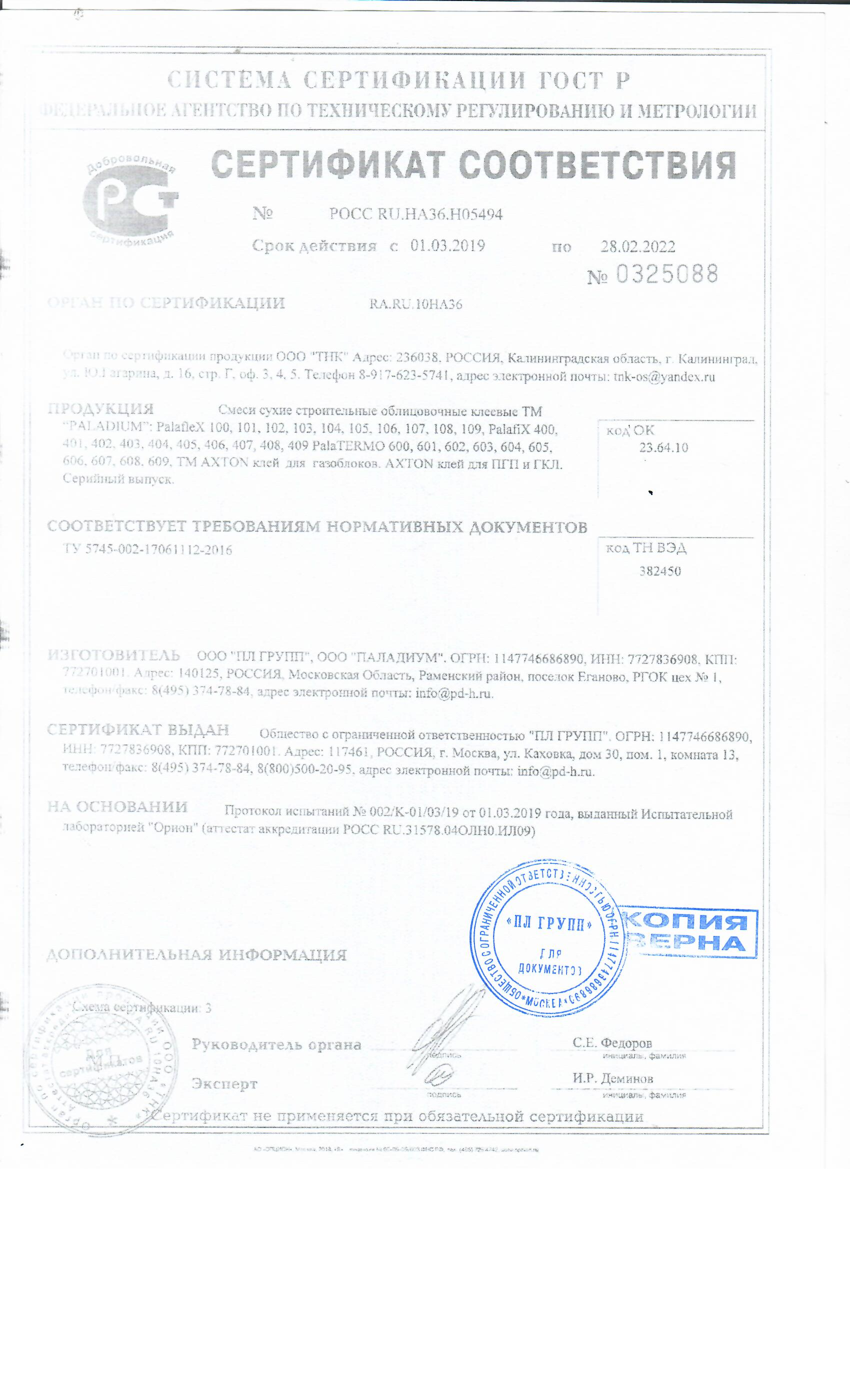 Смесь сухая клеевая на гипсовом вяжущем PALADIUM PalafiX - 403 ТУ 5745-002-17061112-2016, ГОСТ 58275-2018. Применяется для кладки стен и перегородок из пазогребневых плит (ПГП), крепления гипсокартонных и гипсоволокнистых листов (ГКЛ и ГВЛ), гипсостружечных плит (ГСП), а также пенополистирольных и минераловатных плит на оштукатуренные, бетонные, газобетонные, кирпичные основания без использования дополнительных механических креплений.