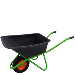 Тачка строительная пластиковое 110 л антиудар, предназначена для тяжелых работ на строительной площадке и садовом участке, для перевозки песка, раствора, а также камней и мусора. Тележка имеет чрезвычайно прочную раму из стальных труб и высококачественный кузов, способный выдерживать большие нагрузки. Два высокопрочных стояночных упора надежно защищают тачку от переворота во время погрузки, а удобные прорезиненные рукоятки обеспечивают надежный обхват и отсутствие проскальзываний во время транспортировки строительных материалов.