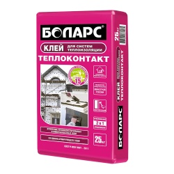 Клей Боларс Теплоконтакт применяется для крепления пенополистирольных и минераловатных плит к минеральным основаниям (кирпичные, каменные, бетонные и газобетонные поверхности) и устройства на них базового штукатурного слоя, армированного стеклотканевой сеткой, в системе Фасадной Теплоизоляционной Композиционной. Обладает повышенной трещиностойкостью, высокой адгезией. Препятствует проникновению влаги к поверхности утеплителя, обеспечивая высокую паропроницаемость. Изготовлен на цементно-песчаной основе, с использованием высокоэффективных полимерных и модифицирующих добавок. Предназначен для нанесения ручным способом при наружных и внутренних работах.