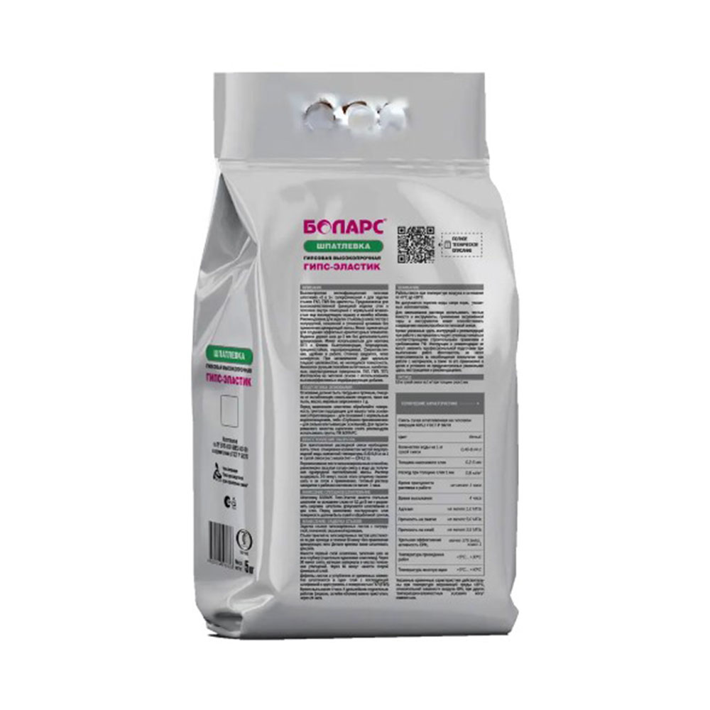 Шпатлевка гипсовая 2в1 суперфиниш для заделки стыков ГКЛ ГВЛ 5 кг Боларс ГИПС-ЭЛАСТИК - высокопрочная мелкофракционная гипсовая шпатлевка "2 в 1": суперфинишная + для заделки стыков ГКЛ, ГВЛ без армирующей ленты. Надежно держит шов до 5 мм без дополнительного армирования. Идеальна для финишной отделки стен и потолков внутри помещений с нормальной влажностью под последующую окраску и оклейку обоями. Рекомендована для заделки стыковых швов листов с полукруглой, скошенной и утоненной кромками без применения армирующей ленты. Может применяться для создания эффектных архитектурных элементов. Благодаря составу, материал сверхпластичный, легко шкурится и шлифуется. При заглаживании дает идеально гладкую шелковистую поверхность. Быстросохнущая, трещиностойкая. Наносится ручным способом на бетонные, газобетонные, оштукатуренные поверхности, ГКЛ, ГВЛ, ПГП.