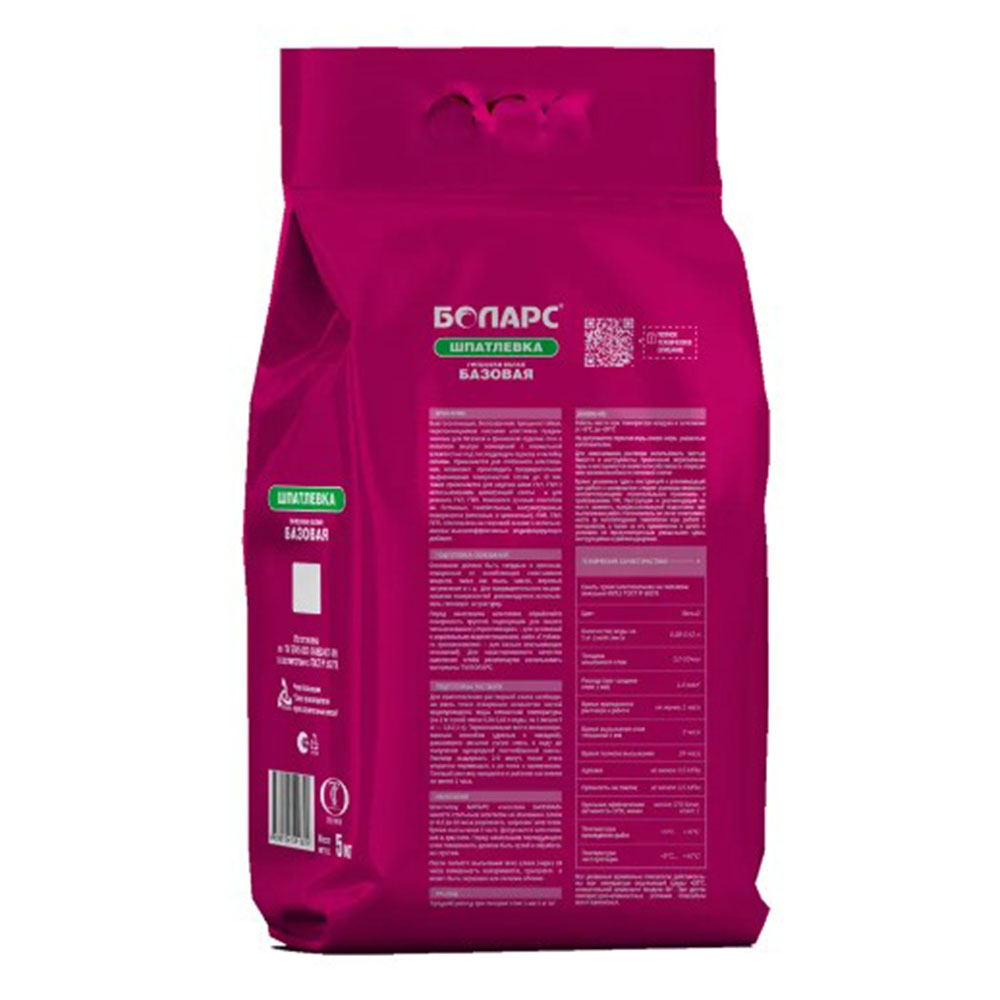 Шпатлевка гипсовая Белая 5 кг 0,2-10 мм Боларс Базовая - это сухая строительная смесь на основе белого природного гипса с добавлением высокоэффективных полимерных модификаторов. Материал предназначен для выравнивания и финишной отделки внутренних поверхностей: стен и потолков в жилых и общественных помещениях с нормальной влажностью. С ее помощью устраняют мелкие дефекты, неровности и шероховатости, создают гладкую, однородную подложку. Продукт подходит для сплошного шпатлевания слоем до 5 мм (допускается нанесение в несколько слоев), заделки швов гипсокартонных и гипсоволокнистых листов (с применением армирующей ленты), а также для локального ремонта поверхностей. Шпатлевка совместима с бетонными, газобетонными, оштукатуренными основаниями, гипсокартоном (ГКЛ), гипсоволокном (ГВЛ) и пазогребневыми плитами (ПГП).