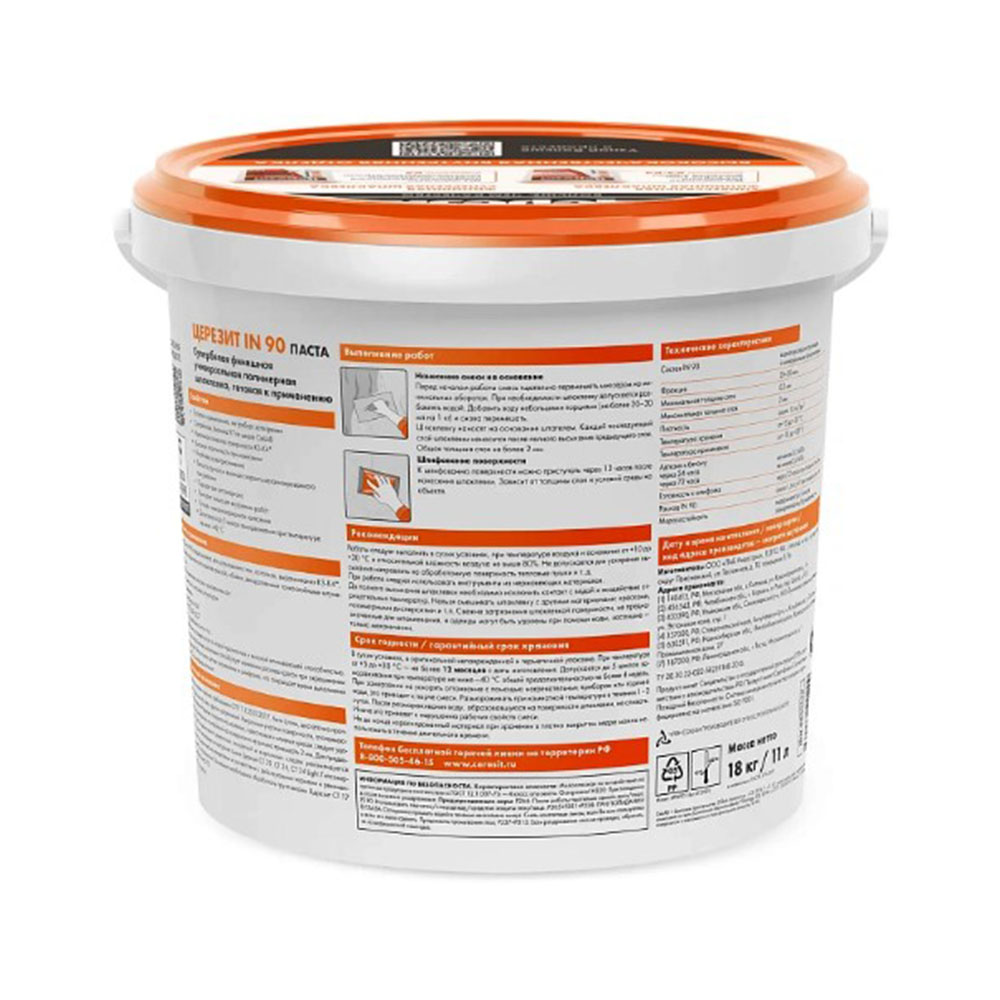 Шпаклевка Финишная готовая универсальная 18 кг Церезит IN90 - предназначена для шпаклевания стен, потолков, выравнивания K3 - K4*. Подходит под финишное покрытие краской, обоями, декоративными тонкослойными штукатурками.