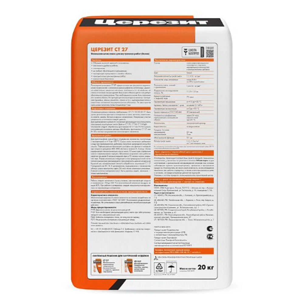 Шпаклевка полимерная финишная Белая для внутренних работ 20 кг ЦЕРЕЗИТ СТ 27 - предназначена для финишного выравнивания поверхностей и заполнения мелких дефектов на стенах и потолках внутри всех типов зданий и сооружений (А-В), в том числе в жилых домах и административных зданиях, офисах, гостиницах, вокзалах и аэропортах, ресторанах и предприятиях торговли, культурно-массовых и спортивных сооружениях, учебно-воспитательных и детских заведениях, в медицинских учреждениях (в т.ч. лечебно-профилактических и санаторно-курортных), а также на промышленных объектах (в т.ч. объектах пищевой, химической, фармацевтической, электронной и энергетической промышленности).
