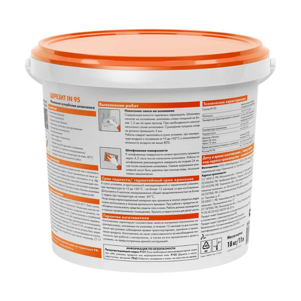 Шпаклёвка финишная готовая всесезонная Супербелый до 3 мм 18 кг Церезит IN 95 PREMIUM - предназначена для использования внутри помещений, обеспечивая универсальное решение для отделки стен и потолков. С объемом 18 кг и белым цветом, она подходит для подготовки поверхностей под покраску. Шпаклевка обладает полимерной основой, что обеспечивает легкость в нанесении и равномерное распределение по поверхности. Она позволяет работать при температуре от 5 до 30 градусов Цельсия, что делает ее пригодной для использования в различных климатических условиях. Толщина слоя может варьироваться от 1 до 3 мм, что позволяет адаптировать материал под конкретные нужды. Время высыхания до следующего этапа работ составляет всего 4,5 часа, что ускоряет процесс ремонта. Шпаклевка не предназначена для использования на полу, дереве или металле, но отлично подходит для бетона. Ее расход составляет 1,7 кг на квадратный метр, а возможность выдерживать до пяти циклов заморозки делает ее устойчивой к перепадам температур.