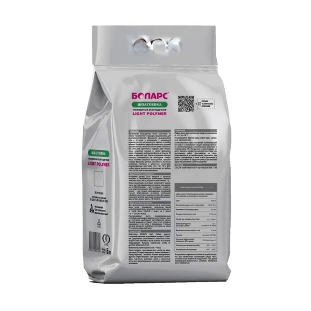 Шпатлевка полимерная финишная 5 кг Белая 0,3-5 мм Аналог LR+ Боларс Light Polymer - предназначена для высококачественного финишного выравнивания стен и потолков в помещениях с нормальной влажностью под последующую окраску и оклейку обоями. Отличается сверхпластичностью, высокой укрывистостью, легкой стыковкой краев. Наносится без наплывов, просветов и задиров. Дает возможность нанесения средних и тонких финишных слоев. Сохраняет работоспособность в течение 72 часов в закрытой таре. После высыхания образует плотную, шелковистую, не мелящуюся поверхность. Отлично шкурится. Безусадочная, трещиностойкая. Наносится ручным способом на бетонные основания, гипсовые и цементные штукатурки, выравнивающие шпатлевки, ГКЛ, ГВЛ, ПГП, ЦПС, любые другие минеральные основания, не требующие толстослойного выравнивания. Расход материала : 1,1 - 1,2 кг сухой смеси на 1 м² при толщине слоя 1 мм. Мешок 20 кг - на 16-18 м². Срок хранения в сухом помещении в ненарушенной заводской упаковке 12 месяцев.