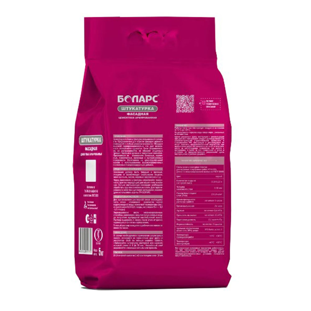 Штукатурка цементная армированная Серая 5-30 мм 5 кг БОЛАРС Фасадная - это сухая строительная смесь на основе цемента с добавлением минеральных наполнителей и модифицирующих полимерных добавок. Материал предназначен для отделки фасадов зданий, а также помещений с любым уровнем влажности. Он подходит как для наружных, так и для внутренних работ, обеспечивая надежное и долговечное покрытие. С ее помощью можно создавать однослойное покрытие или использовать в качестве базового слоя под шпатлевку. Смесь эффективно заполняет сколы, раковины и другие дефекты старых штукатурок, кладок, легкого и ячеистого бетона. После нанесения поверхность готова к последующим отделочным работам: окрашиванию, нанесению декоративных штукатурок, оклейке обоями или облицовке плиткой. Благодаря высокой паропроницаемости материал позволяет поверхности «дышать», предотвращая накопление влаги и развитие плесени.