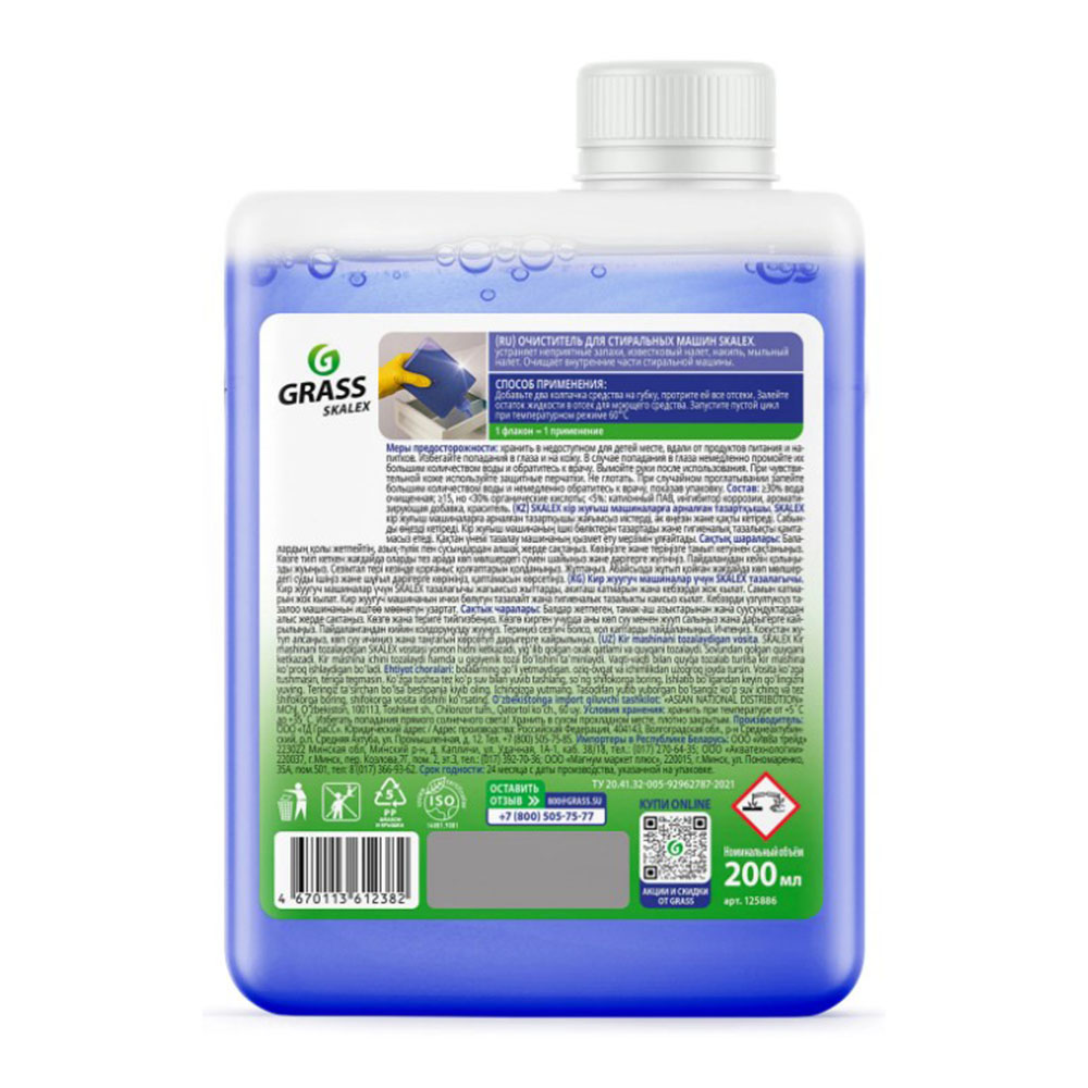 Очиститель для стиральных машин 200 мл SkaleX - устраняет неприятные запахи, известковый налет и накипь. Удаляет мыльный налет. Очищает внутренние части стиральной машины и обеспечивает гигиеническую чистоту. Регулярная чистка от накипи увеличивает срок службы машины.