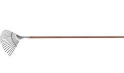 Грабли веерные, 22 плоских зуба, охват рабочей части 440 мм. Деревянный черенок длиной 1200 мм. Секторная пластина дополнительно упрочняет конструкцию. Предназначены для сбора опавшей листвы, срезанных веток, сорняков, садового мусора. Зубья выполнены из пружинной стали 65Г и имеют повышенную жесткость, что обеспечивает удобство в работе. Порошковая окраска зубьев защищает инструмент от коррозии. Черенок изготовлен из красного дерева и покрыт лаком.