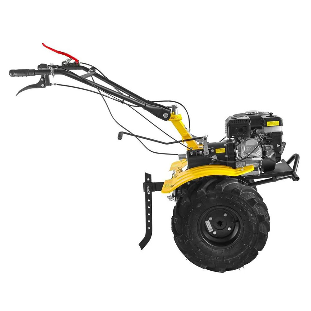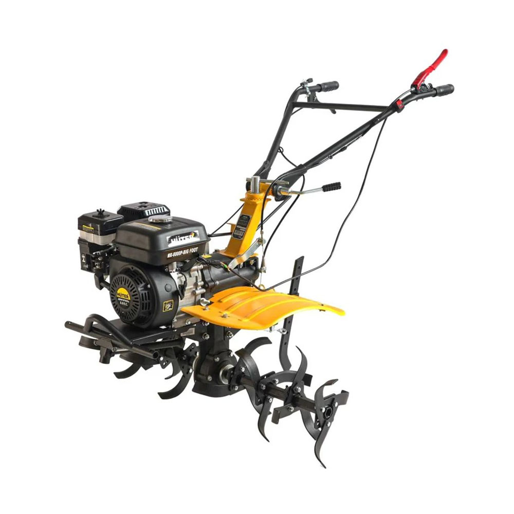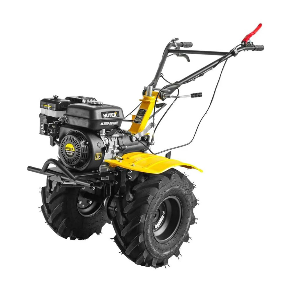 Мотоблок MK-8000P BIG FOOT Huter 70/5/13 - предназначен для обработки почвы посредством культивации на больших дачных участках и в фермерских хозяйствах. Агрегат представляет собой мотоблок с четырёхтактным одноцилиндровым, бензиновым двигателем, мощность которого составляет 8 л.с. Мотор оснащён воздушным фильтром с масляной ванной, который обеспечивает стабильную работу в условиях сильной запылённости. Объём топливного бака – 3.6 л, расход 375 гр/кВт в час. Привод активной подвески – ВОМ 14 мм. Передача через вал отбора мощности более надежна, чем ременная и выдерживает серьезные нагрузки. Редуктор шестеренчатый в масляной ванне размещен в чугунном корпусе. Ключевым отличием HUTER MK-8000P BF от аналогов с такой же мощностью является наличие больших колёс 19х7-8 с агрессивным протектором, которые обеспечивают хорошую проходимость. Мотоблок имеет две передачи вперёд и одну назад, что позволяет обрабатывать сложные участки почвы, включая целину, минимизировать застревания и хорошо маневрировать. Ширина обработки составляет 100 см. Глубина регулируется сошником. Диаметр фрез – 30 см. Мотоблок HUTER MK-8000P BF оснащён удобными рукоятками, на которых размещены элементы управления. Безопасность обеспечена наличием широких крыльев, защищающих оператора от попадания земли и посторонних предметов.