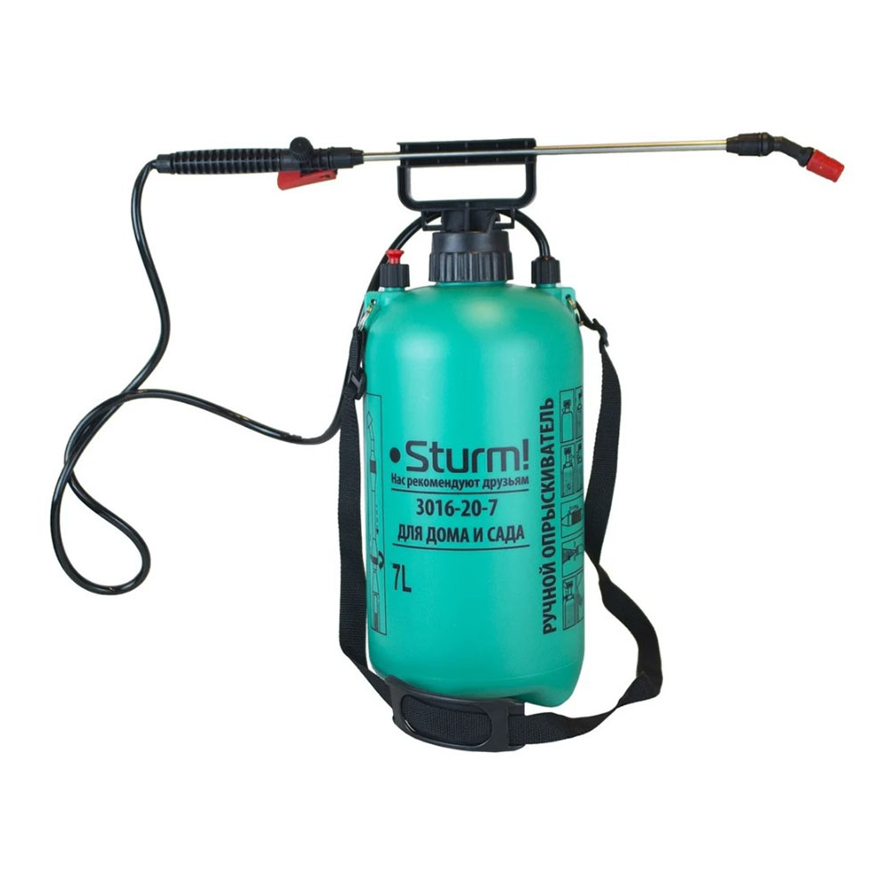 Опрыскиватель 7л с ручным насосом и шлангом Sturm - с ручным насосом и шлангом Sturm 3016-20-7 предназначен для сада. Используется для внесения жидких удобрений. Прост в эксплуатации. Оснащен клапаном безопасности, через который выходят излишки воздуха - для защиты от поломок. Наличие плечевого ремня обеспечивает удобство при переноске модели.