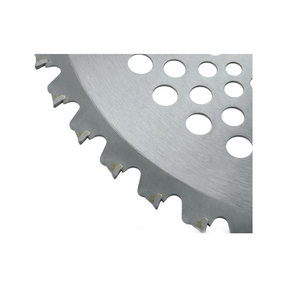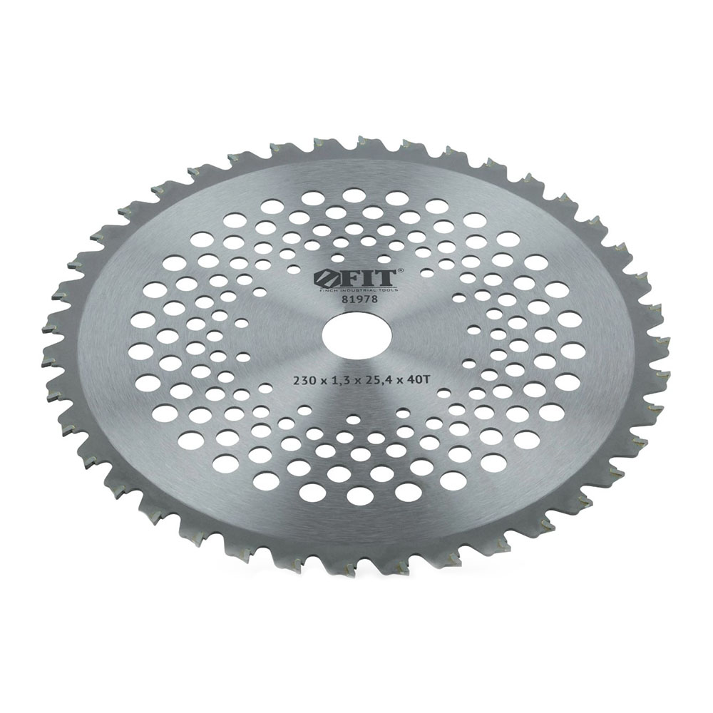 Диск для триммера карбидный 230х25,4х40Т FIT - предназначен для скоса и измельчения травы, кустарников и тонких стволов деревьев. Изготовлен из прочной инструментальной стали. Карбидные режущие вставки на зубьях способствуют эффективному и быстрому резу.