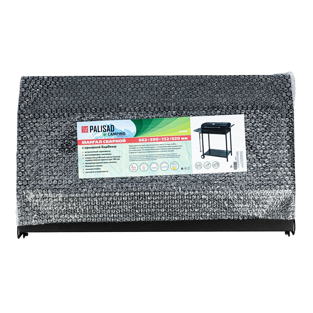Мангал сварной на колесах 662х390х920 мм кочерга в комплекте PALISAD Camping - поставляется в комплекте с кочергой. Используется для приготовления блюд из мяса, рыбы, птицы и овощей на дровах или древесных углях. Позволяет организовать пикник и комфортный отдых на дачном участке. Многофункциональность — крышка позволяет прогревать продукты со всех сторон, открыв ее, можно продолжить готовку на открытом огне. Прочность — надежная конструкция из жаропрочной углеродистой стали, усиленная ребрами жесткости, рассчитана на долгий срок службы. Долговечность — топка окрашена термостойкой краской, на ножки, боковой столик и полки нанесено защитное порошковое покрытие. Продуманная конструкция — на боковом столике можно разместить шампуры и другие аксессуары, а на нижней полке — посуду или запас топлива. Постоянный приток кислорода — отверстия в корпусе обеспечивают хороший воздухообмен, а дополнительные заслонки позволяют регулировать поток воздуха под крышкой. Комфортное использование — в корпусе предусмотрены прорези для шампуров, на крышке расположен термометр для точного контроля температуры. Удобное перемещение — мангал снабжен транспортировочной рукояткой и 2 колесами.